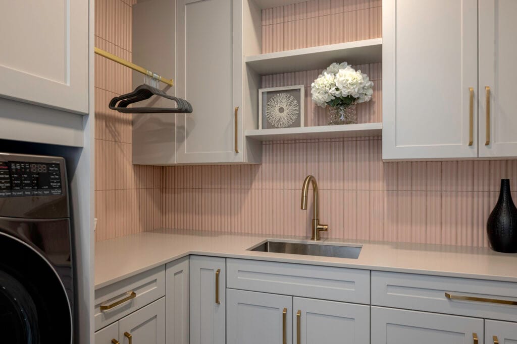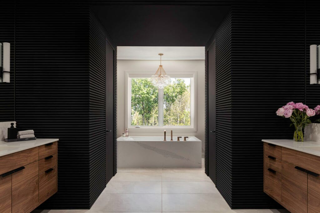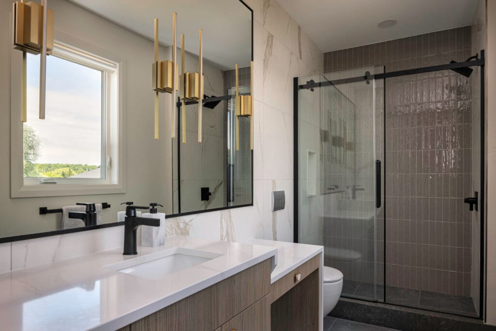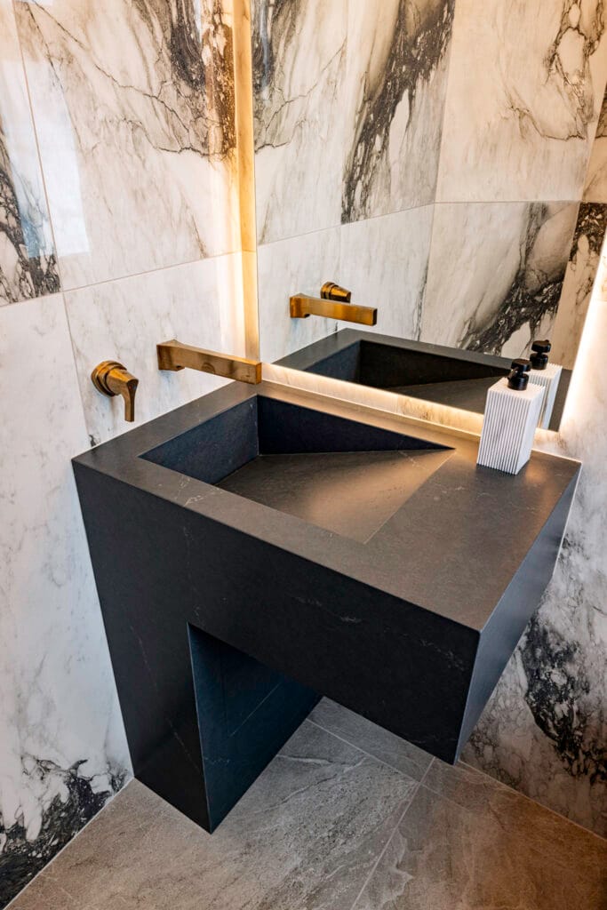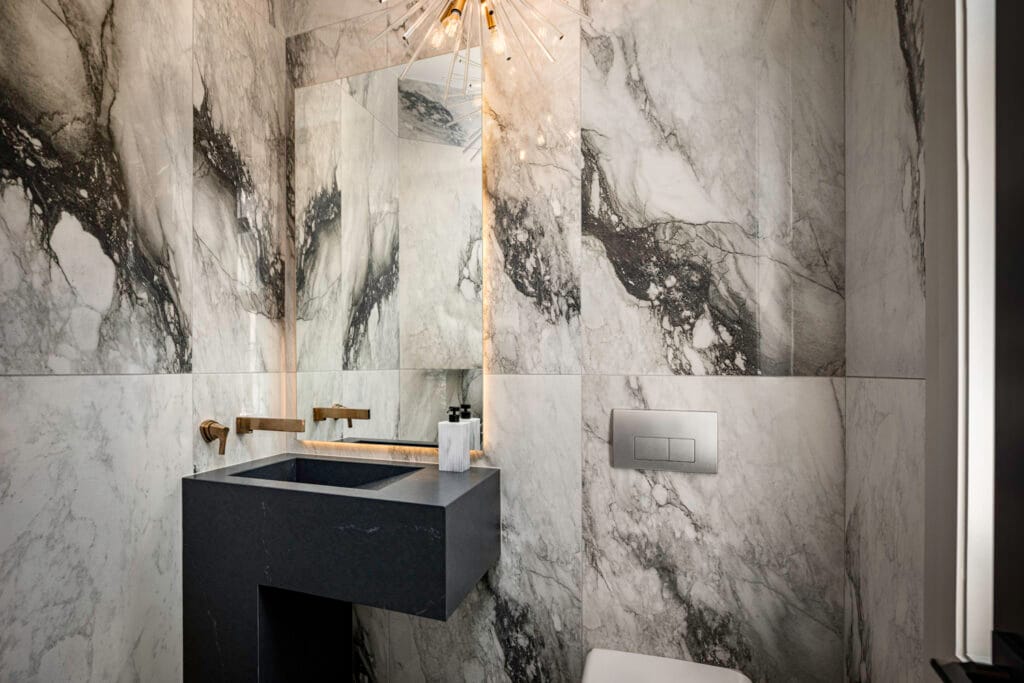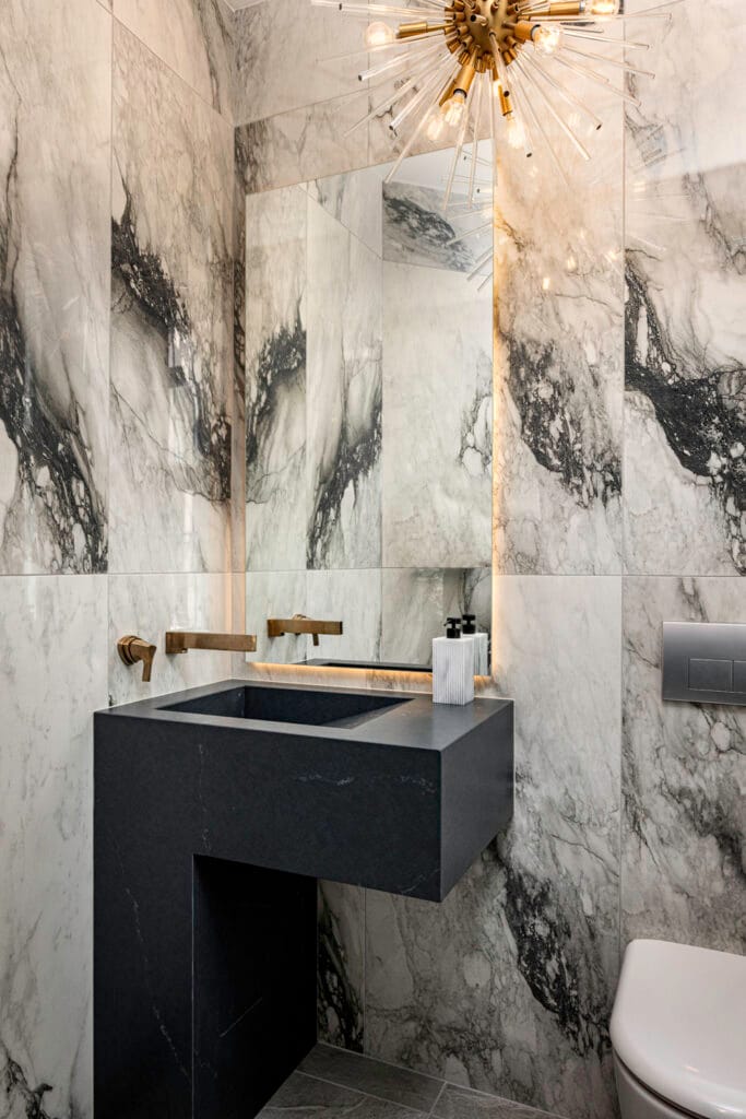 Upstairs, Silestone or Caesarstone were used in each of the three ensuites on this level, with the primary ensuite merging Ethereal Noctis sinks with Dusk counters to gorgeous effect. Even the basement was thought of, with a backlit stone bar and a powder room with a granite hand dryer feature wall.
