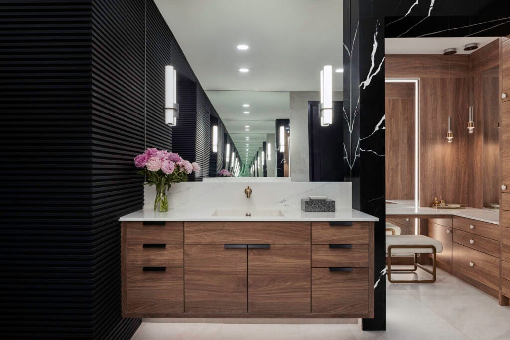 Materials: Silestone Eternal Calacatta Gold Quartz, Interstone Cambrian Black Antique Granite, Granite Nero Striatto Honed, Interstone Sahara Noir, Interstone Quarzo Rosa Translucent Onyx, Silestone Miami Vena, Silver Pearl Granite, Silestone Charcoal Soapstone, Silestone Eternal Marquina Polish, Silestone Ethereal Dusk, Caesarstone Frosty Carrina, Silestone Desert Silver