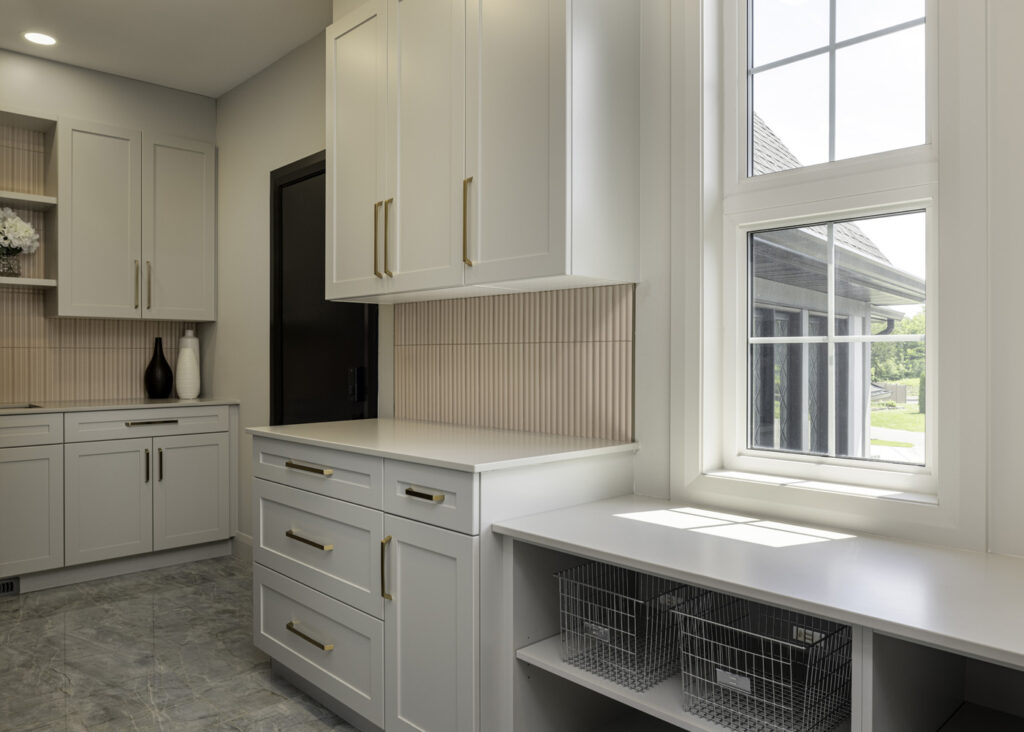 On the main floor, the kitchen was completed with a full-height quartz backsplash and countertops as well as a raised island with a 3-sided mitred waterfall box on one end. Elsewhere, the dining room bar, fireplace, and bathrooms incorporated unique stone touches.